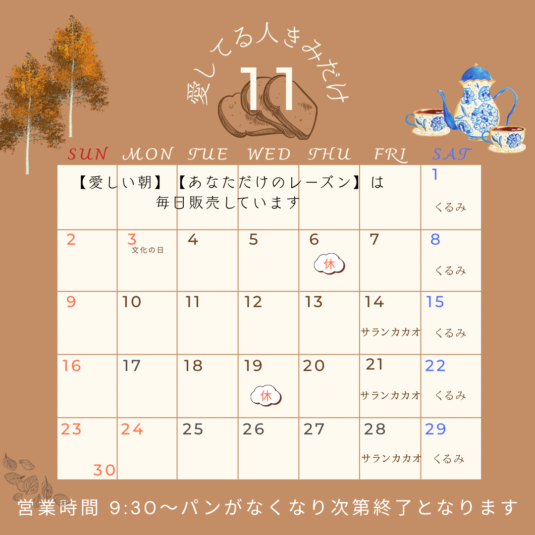 今年も残すところ2カ月となりました。11月の販売予定のご案内でございます。♦冬の期間限定【サランカカオ】販売を始めます(*^^*)温かい和紅茶やコーヒーとの相性も抜群 ( *´艸`)週末のデザート食パンです♡ぜひご賞味くださいませ。
