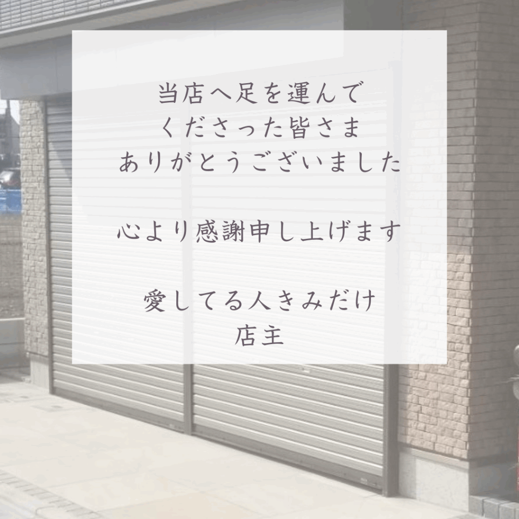 トップページ>NEWS>これまでのお礼 2026.4.6 NEWS これまでのお礼 平素は格別なお引き立てを賜り厚く御礼申し上げます。 このたび諸般の事情を鑑み、令和8年4月20日をもちまして閉店する運びとなりました。これまで続けてこれましたのは、ひとえに皆さまの温かいご支援とご愛顧によるものと、こころから感謝申し上げますとともに、数々のお励ましにお応えできなかったことを深くお詫び申し上げます。 皆さまのますますのご健勝とご活躍を心よりお祈り申し上げます。令和8年4月 ■--愛してる人きみだけ 店主--■